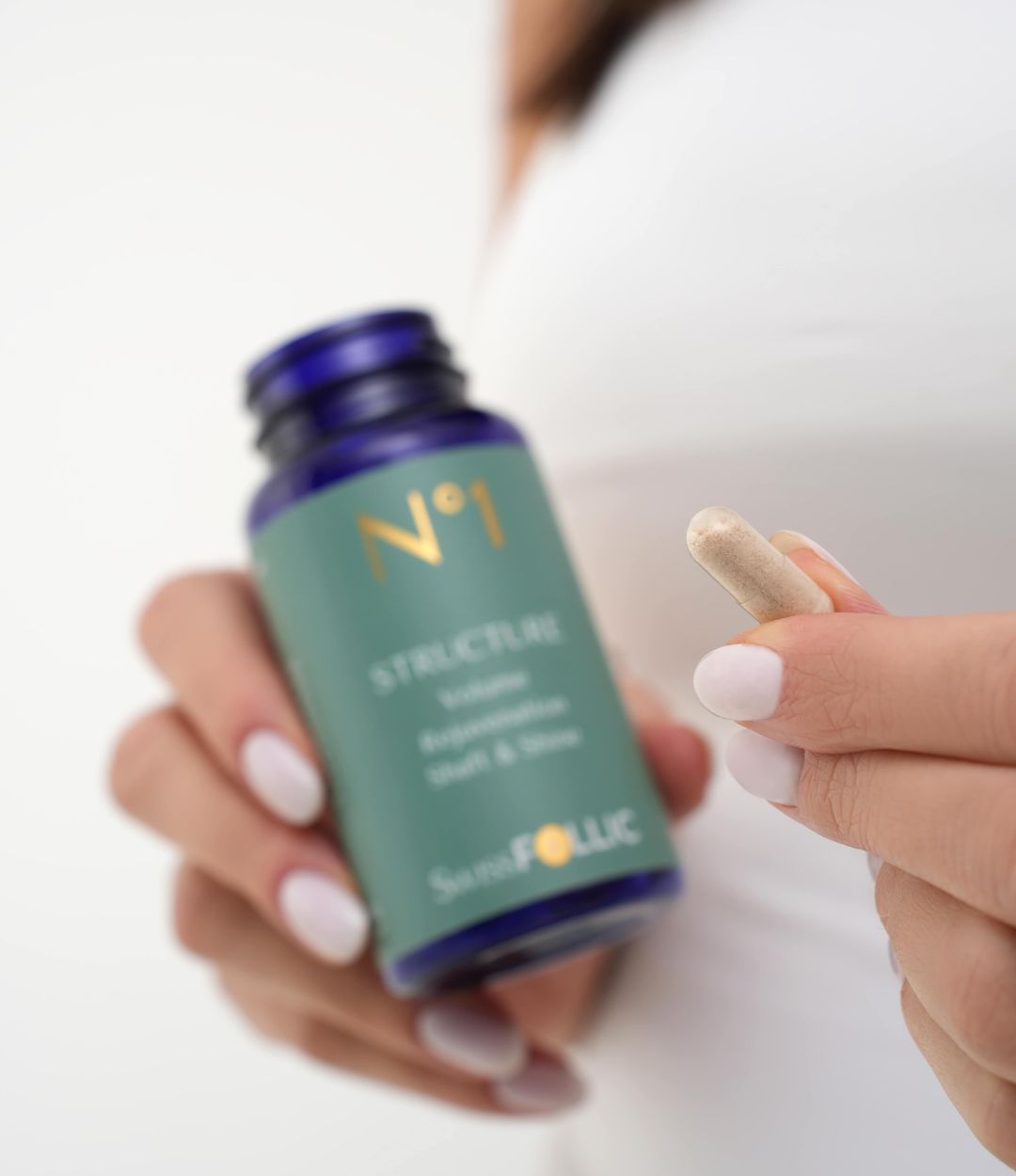 After your evening meal, take N°1 Structure to fortify your hair from within as you sleep, ensuring you wake up with healthier, stronger strands.